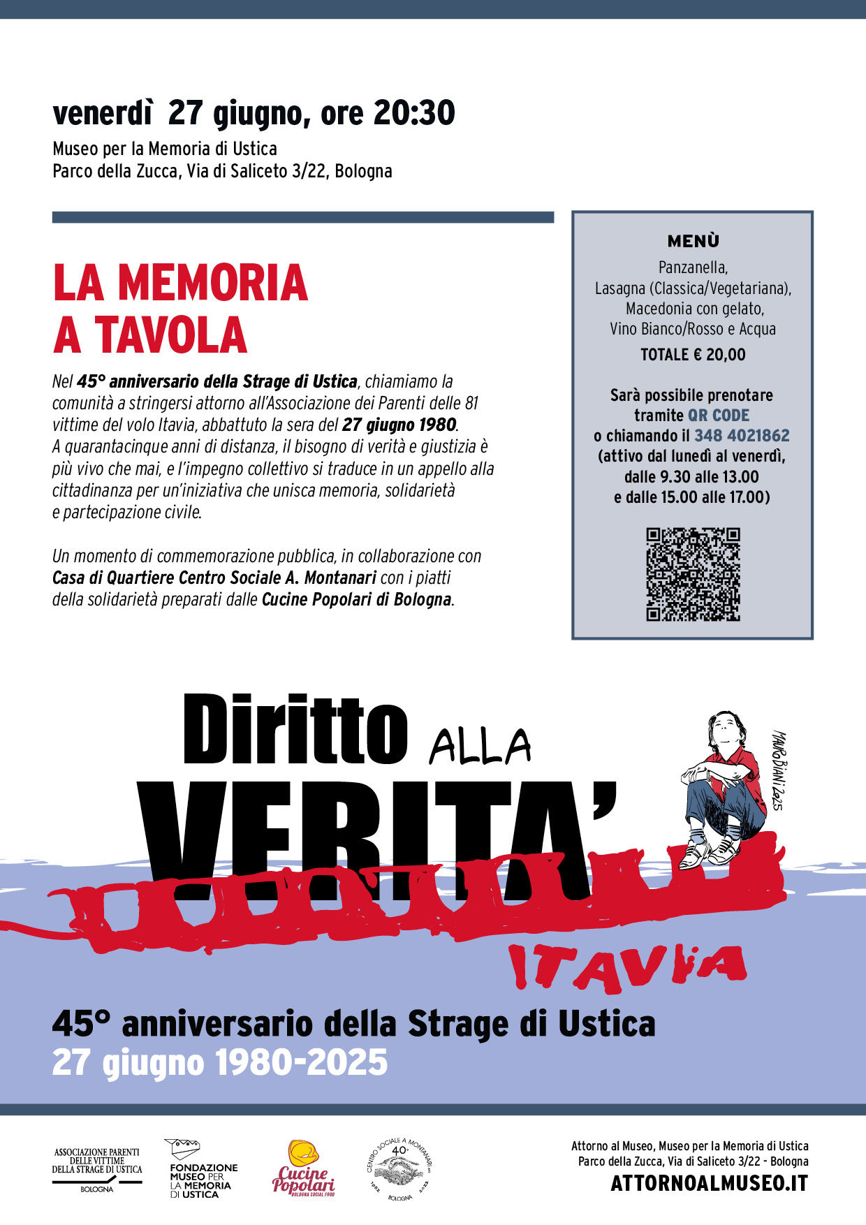 Venerdì 27 giugno 2025, a Bologna, alle ore 20.30, l’Associazione Parenti delle Vittime della Strage di Ustica organizza La Memoria a Tavola, una tavolata solidale con i piatti di Cucine Popolari - Bologna Social Food accanto al Museo per la Memoria di Ustica (parco della Zucca, via di Saliceto 3/22). Prenotazioni sul sito eventbrite.it o telefonando al numero 348 4021862.